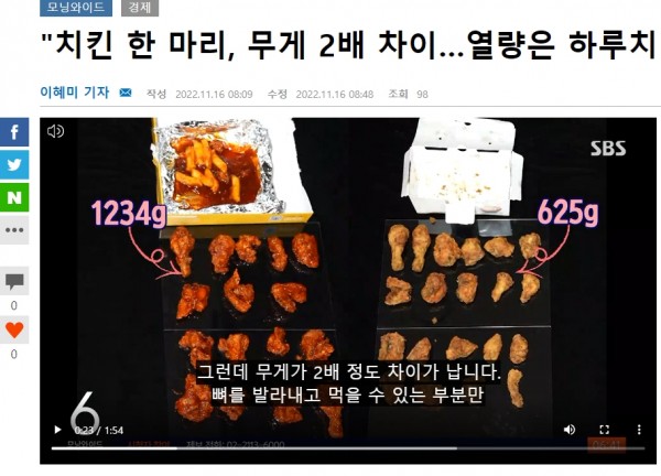 뉴스보는데 프랜차이즈 업체에 따라 치킨 무게가 다르다는 내용이 나옵니다.